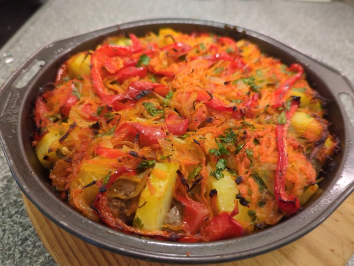 Baked meat ratatouille makes a satisfying meal, full of flavour and colour, perfect for lunch or dinner.