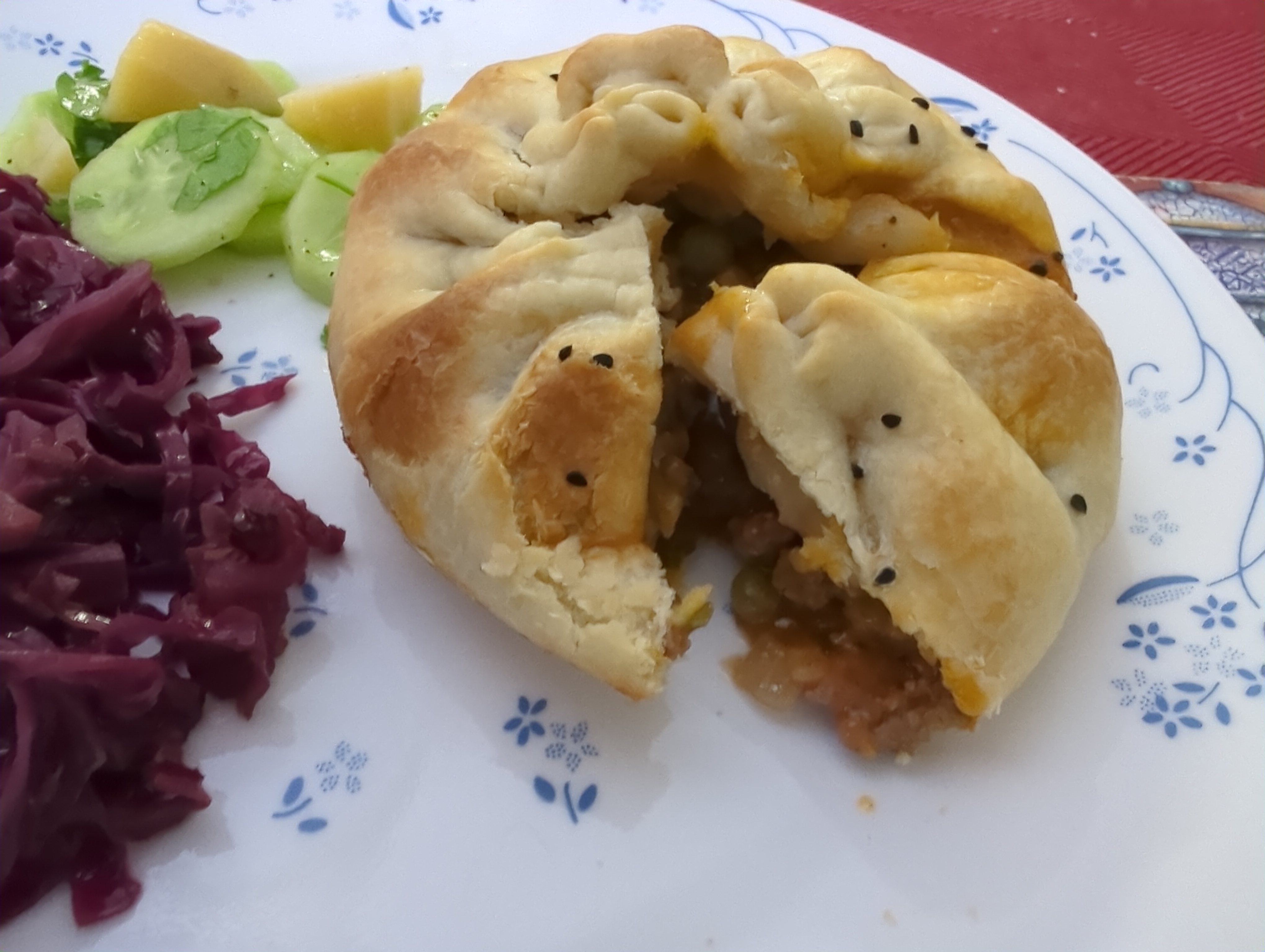 These delightful savoury mince parcels were made with pork and veal mince but you could use any mince that you prefer or even use leftover baked meat cut into small pieces.