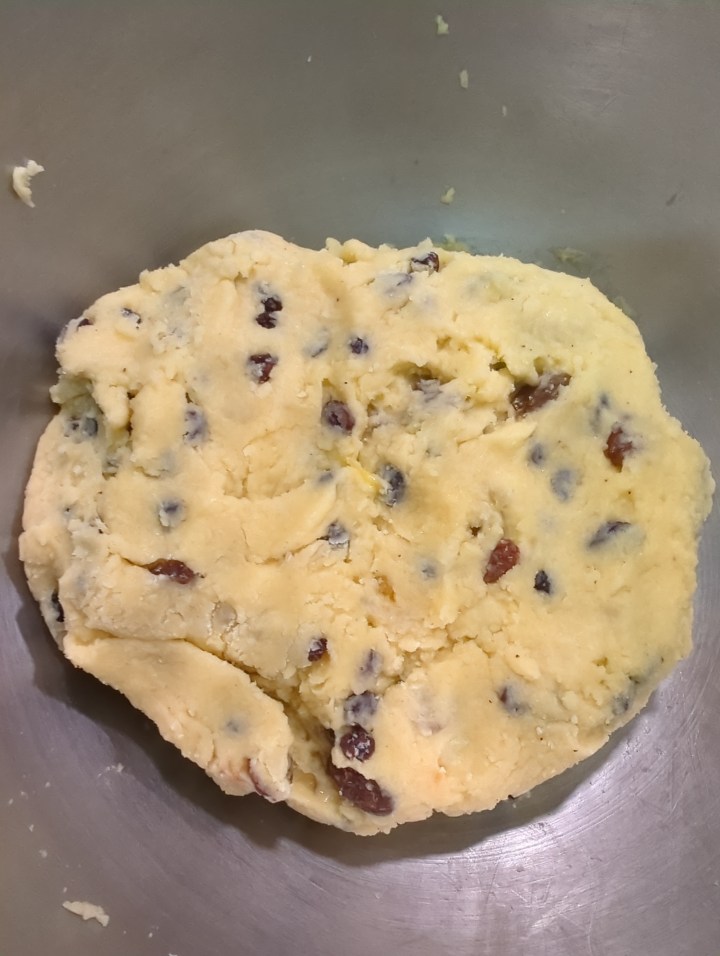 5. Add the sultanas, currants, candied citrus peel and sugar to flour mix