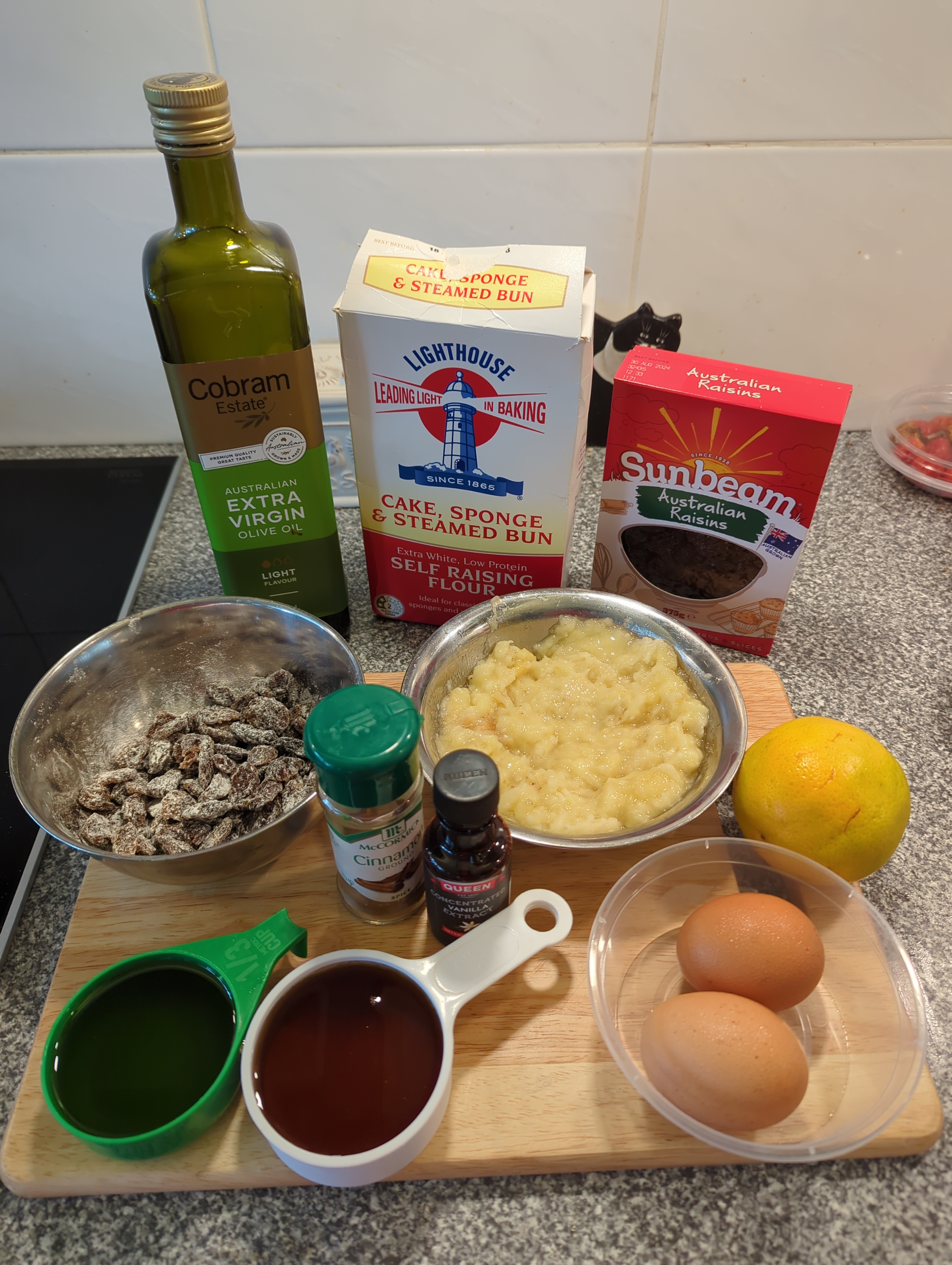The full flavour of the bananas marries well with the best one hundred percent Canadian maple syrup, ground cinnamon and orange zest. Along with the self raising flour, the base is olive oil and uses only two eggs and 1/4 cup of milk. The addition of the raisins offers a perfect pop of sweetness as well as added moisture. It is quite an economical cake.