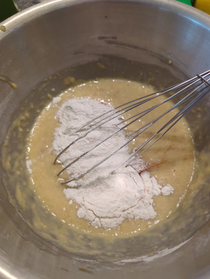 6. Add the mashed banana to the mixture and whisk till well combined