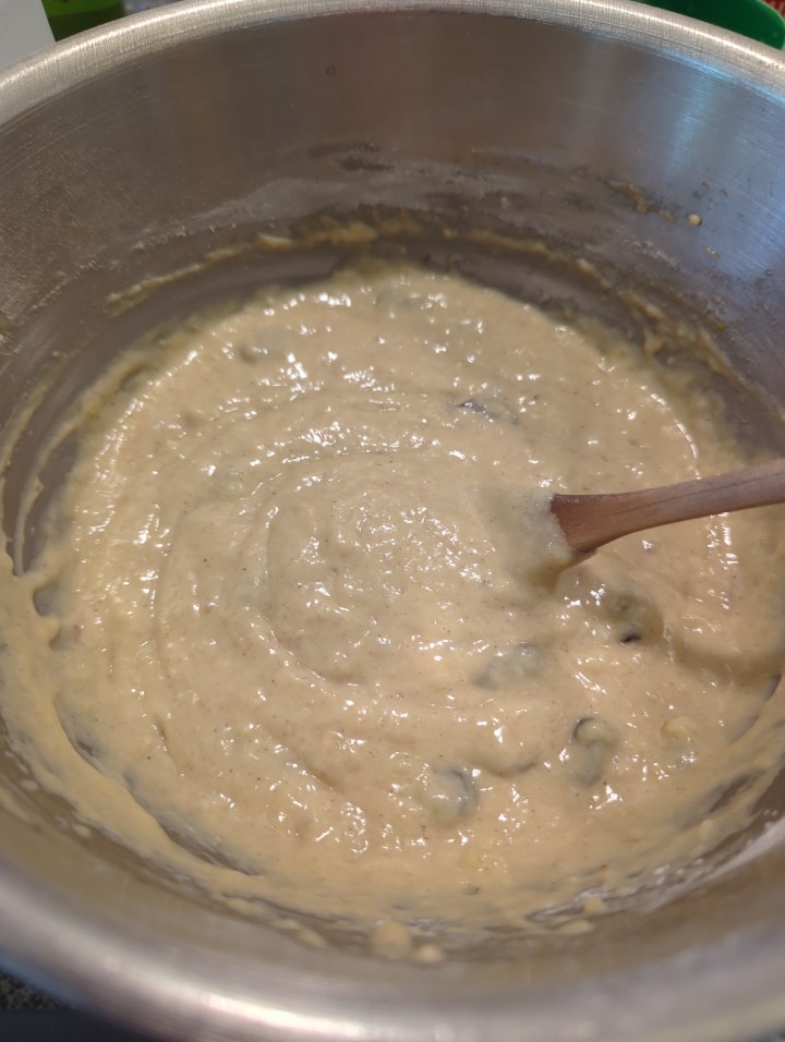 Once the bananas are mashed, this is an easy two bowl cake using just a whisk and a wooden spoon to mix the wet and dry ingredients. It is very quick cake to mix and quick to bake.