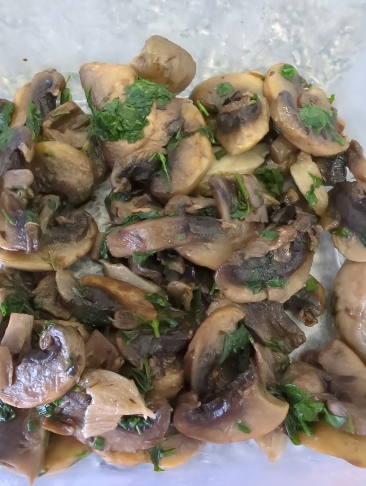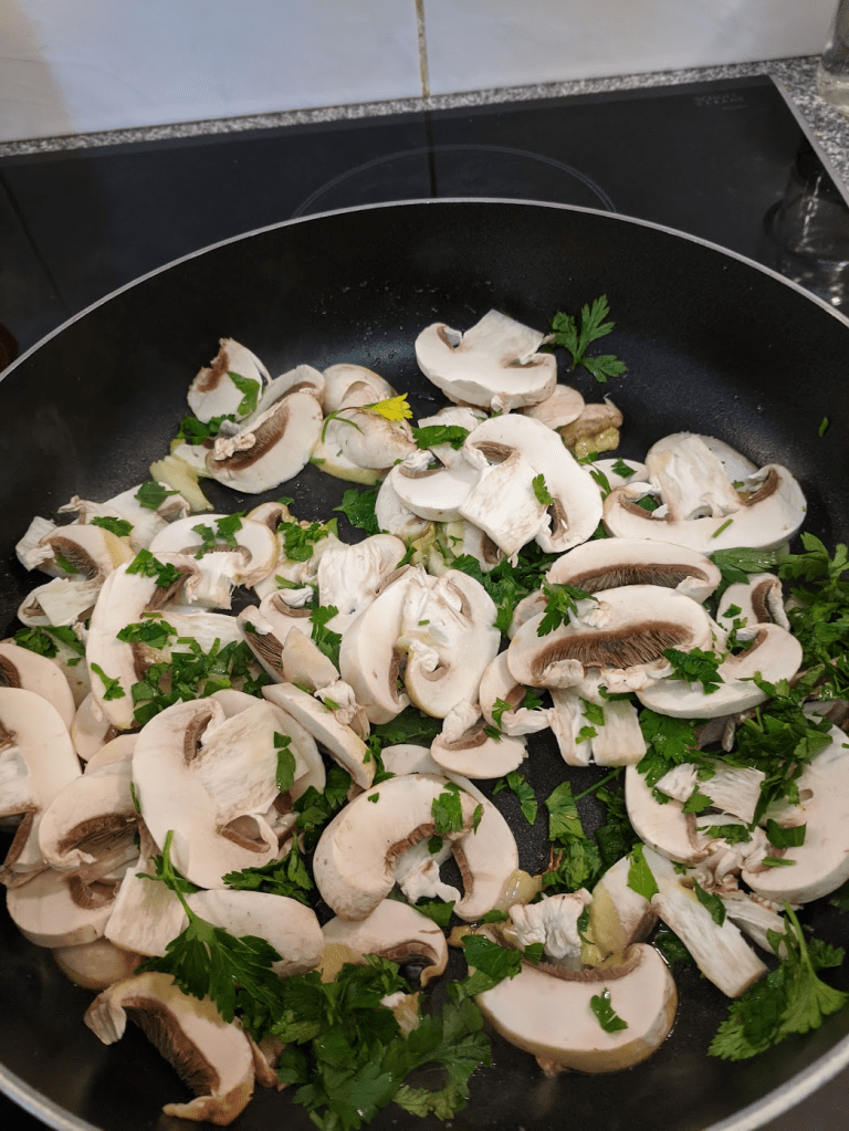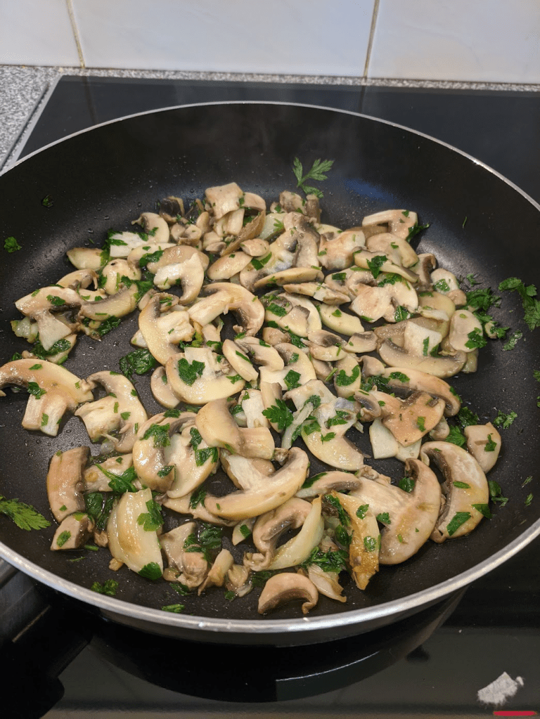 14. Put the mushrooms and chopped parsley, in a single layer, into the saucepan and start the timer.
