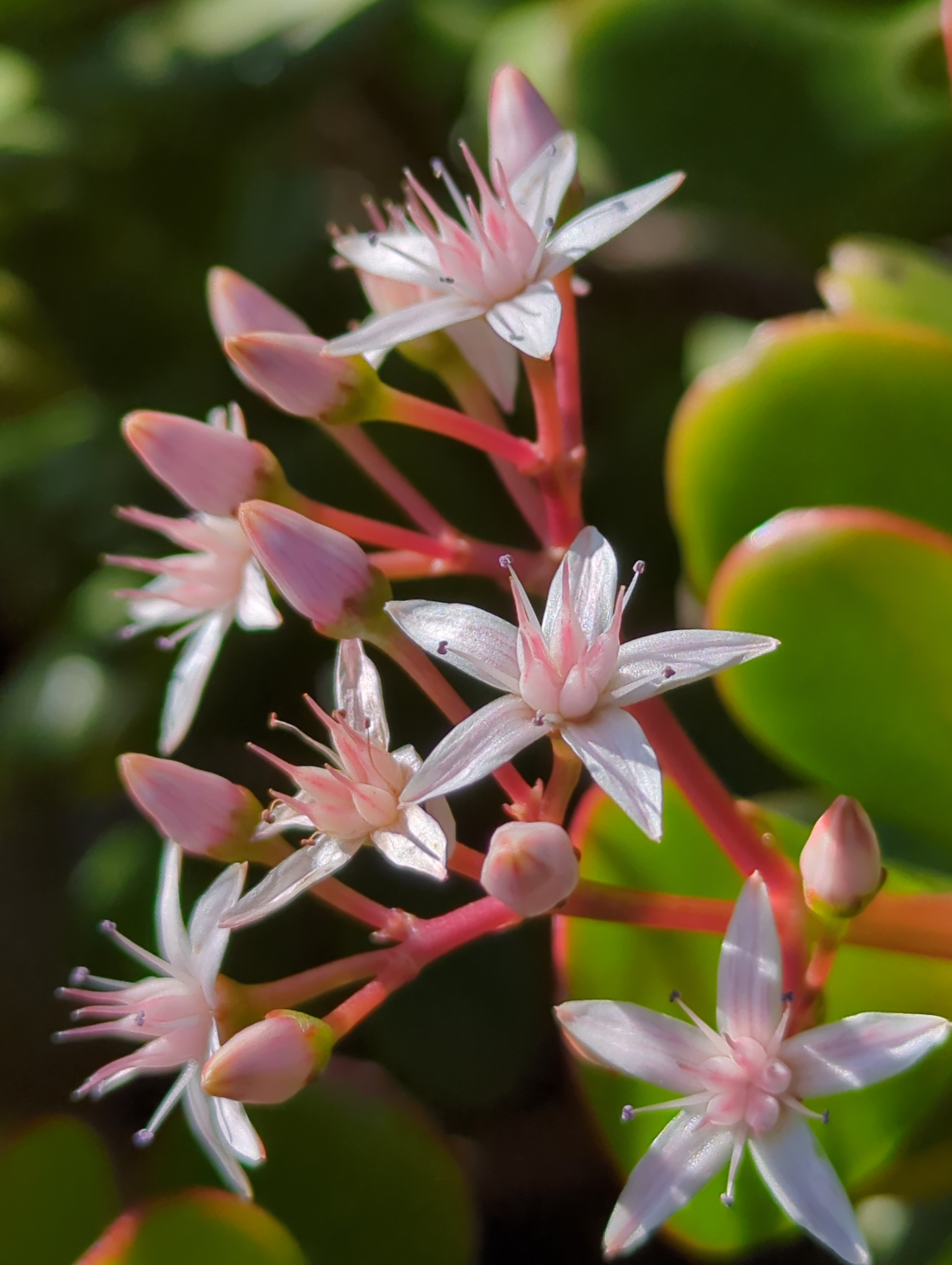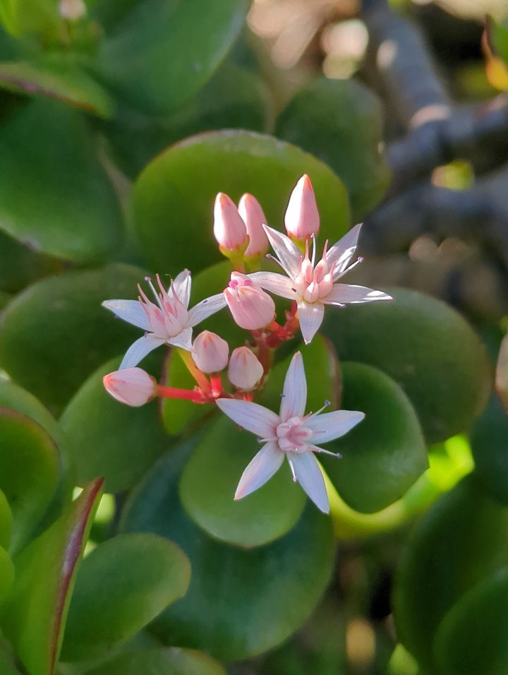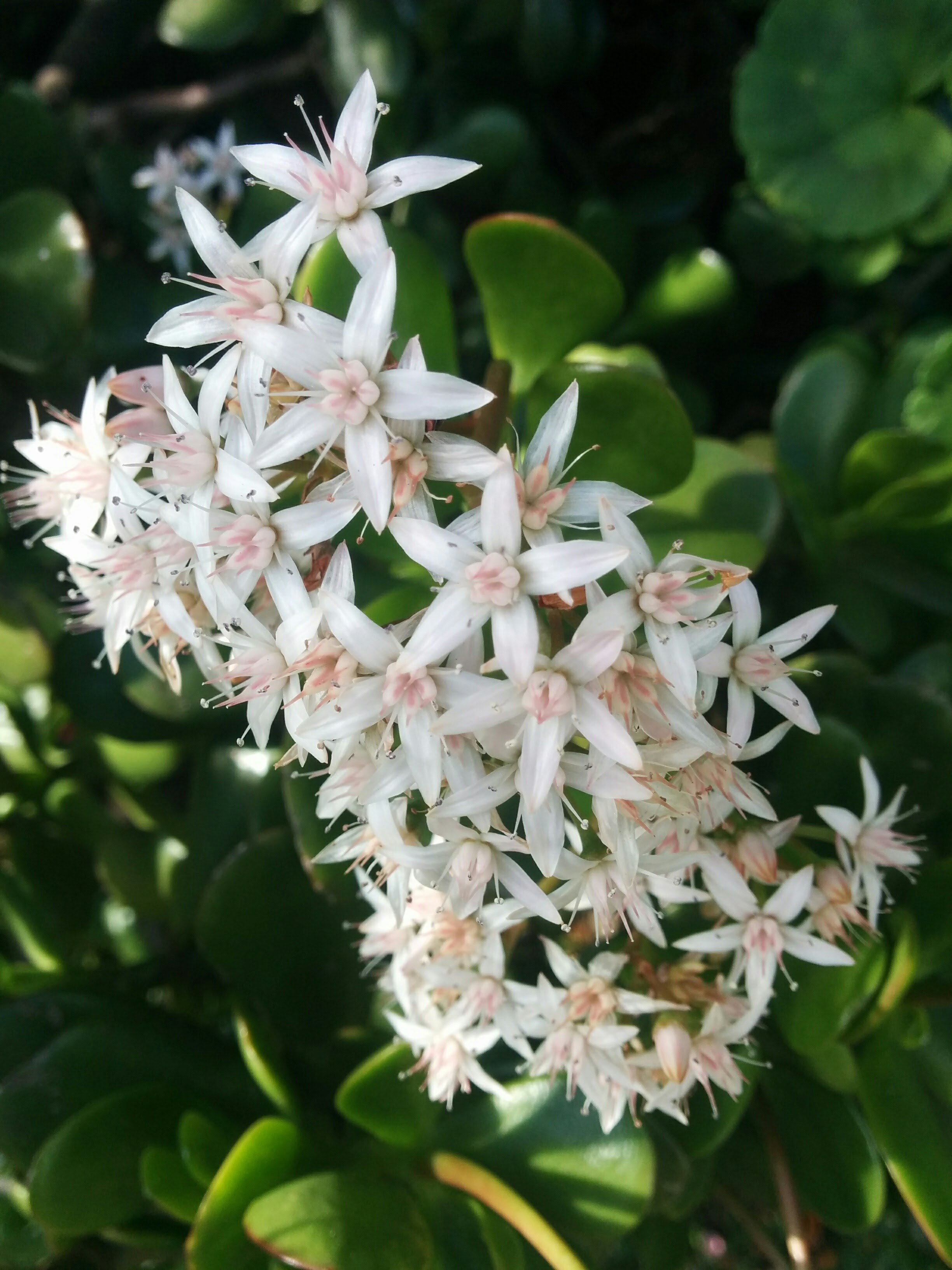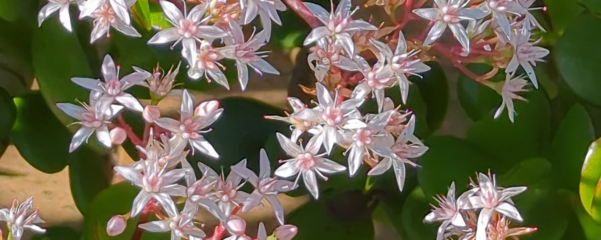 During the cloudy grey days of winter, the beautiful Crassula ovata, popularly known as the Jade or Lucky plant, sparkles with starry, pink tinged, white flowers borne in massed inflorescences that can cover the entire plant. they are so stunning that they cause you to stop and look at their delicate beauty.