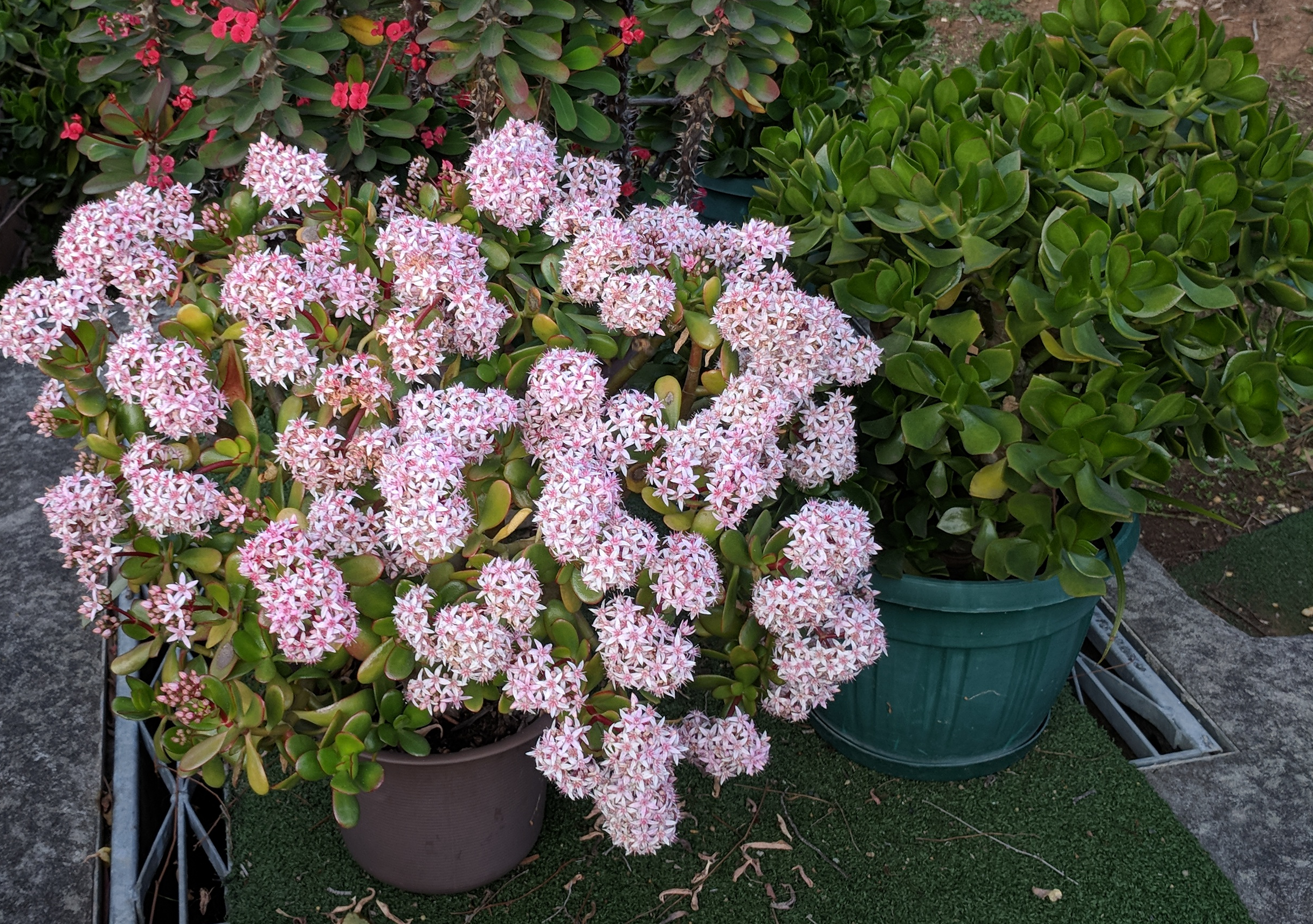 When Crassula ovata matures, it produces small white or pink, star-like shaped flowers in winter. The shorter days, cold nights and lack of water for several weeks will induce flowering around the beginning of winter. To induce a potted plant to flower, gradually move it into a sunny or brightly lit position during summer and autumn.
