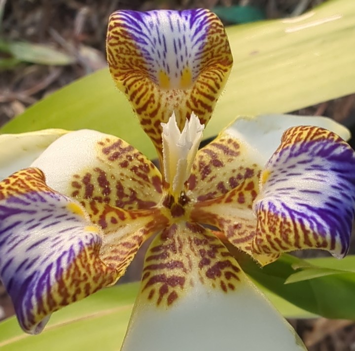 Each flower has six tepals, arranged in two sets with the outer tepals larger than the inner retroflexed petals. the outer tepals are smooth and white with brown markings at the base. The inner retroflexed petals also have brown markings at the base. Where the petals rise to retroflex there are two yellow slightly fuzzy markings.These may be to guide and to attract bees and other pollinators to the reproductive part of the flower. The white lines on the petals could also serve as nectar guides. The blue markings on the petals would also be attractive to pollinators. While the outer tepals are smooth and white, the three petals are hairy underneath and textured. (Click on the images above and below for more detail). The three stamens are not fused together. The style is divided into three branches, each of which usually has two lobes.