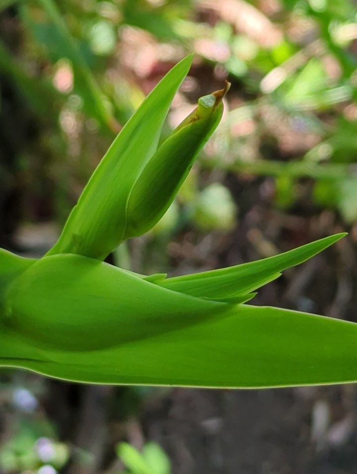 When the Walking iris is ready to flower, the bud swells at the tip of a leaf as shown below.