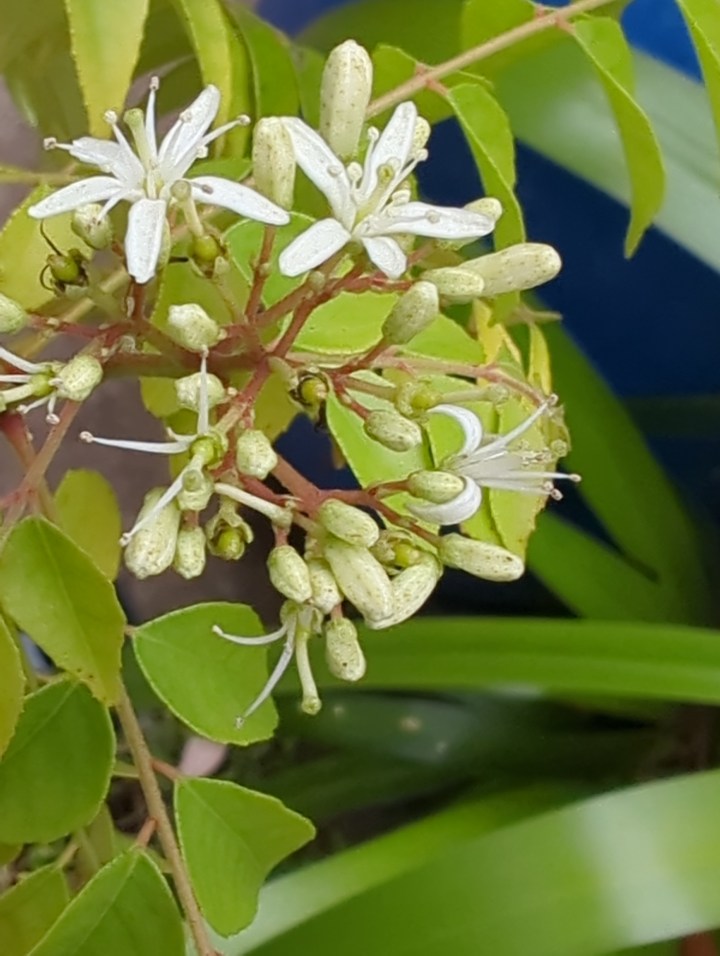 Curry tree flowers have a sweet and spicy fragrance to attract pollinators like bees and other insects and are self pollinating. In the image above note the spider on the lowest petal.