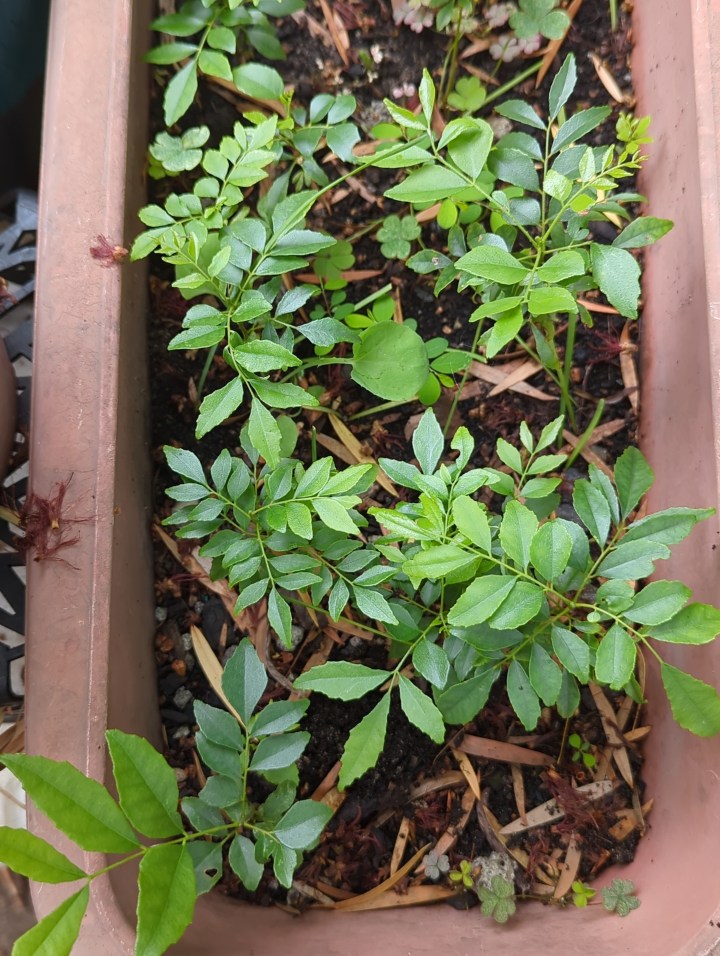 The seedlings have had a growth spurt since summer began. Sydney had its extreme weather with 42 C and mid to high 30C with abundant rain across the two months. February is the hottest summer month in Sydney and we will be moving into another heat wave next week and I will again be moving the young seedlings into more dappled shade under a tree canopy. All this demonstrates that the Curry tree needs hot weather between 18- 35 C to grow well with environmental moisture throughout to provide humidity.