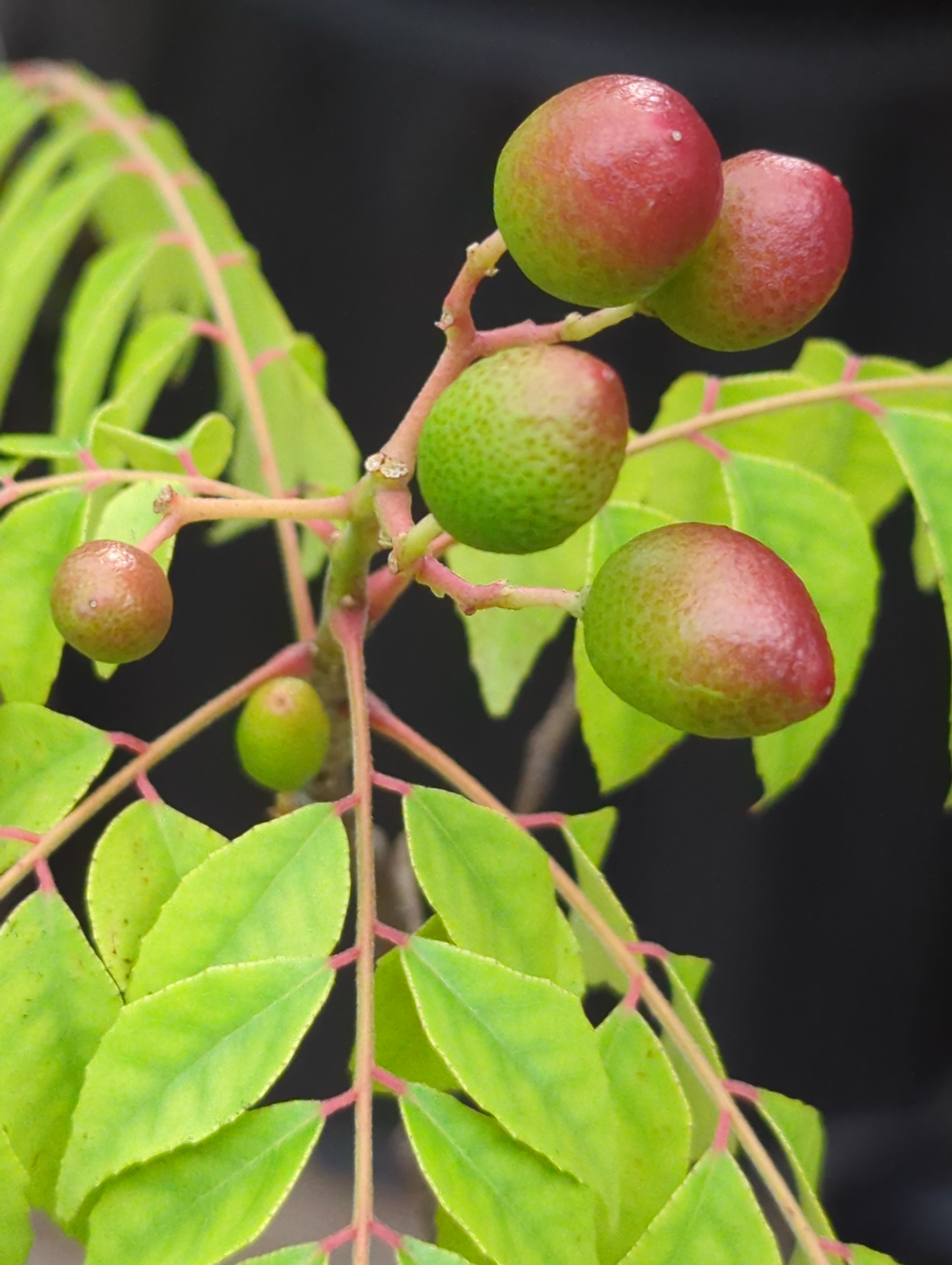 Each red – brown coloured rachis is made up of 11-21 leaflets that are 2.5 – 5.0 cm long and 1-2 cm wide, each on a short stalk of about 0.5 cm long and are arranged alternately. The leaf margins are irregularly serrated. Curry leaves are shiny and smooth, ovate, and lance shaped with paler undersides and a have reticulate venation.