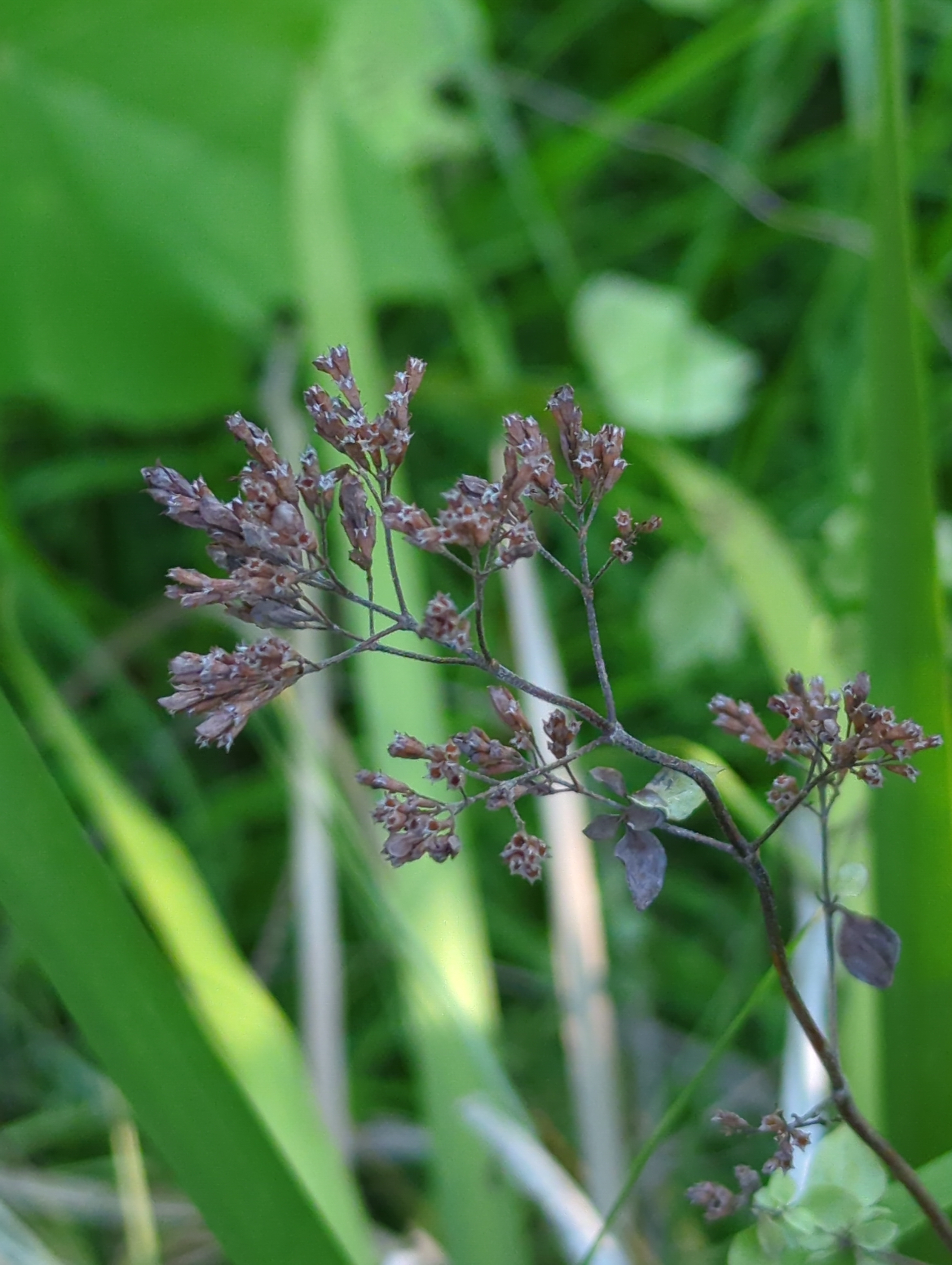 The leafy purple-toned bracts come into bloom where the leaf joins the branch stem or in terminal corymb-like spikes arising from above the foliage in summer. A corymb is a raceme or cluster in which the stalks that support the lower flowers are longer than those of the upper flowers so that the inflorescence has a flattened appearance as in the the image below.