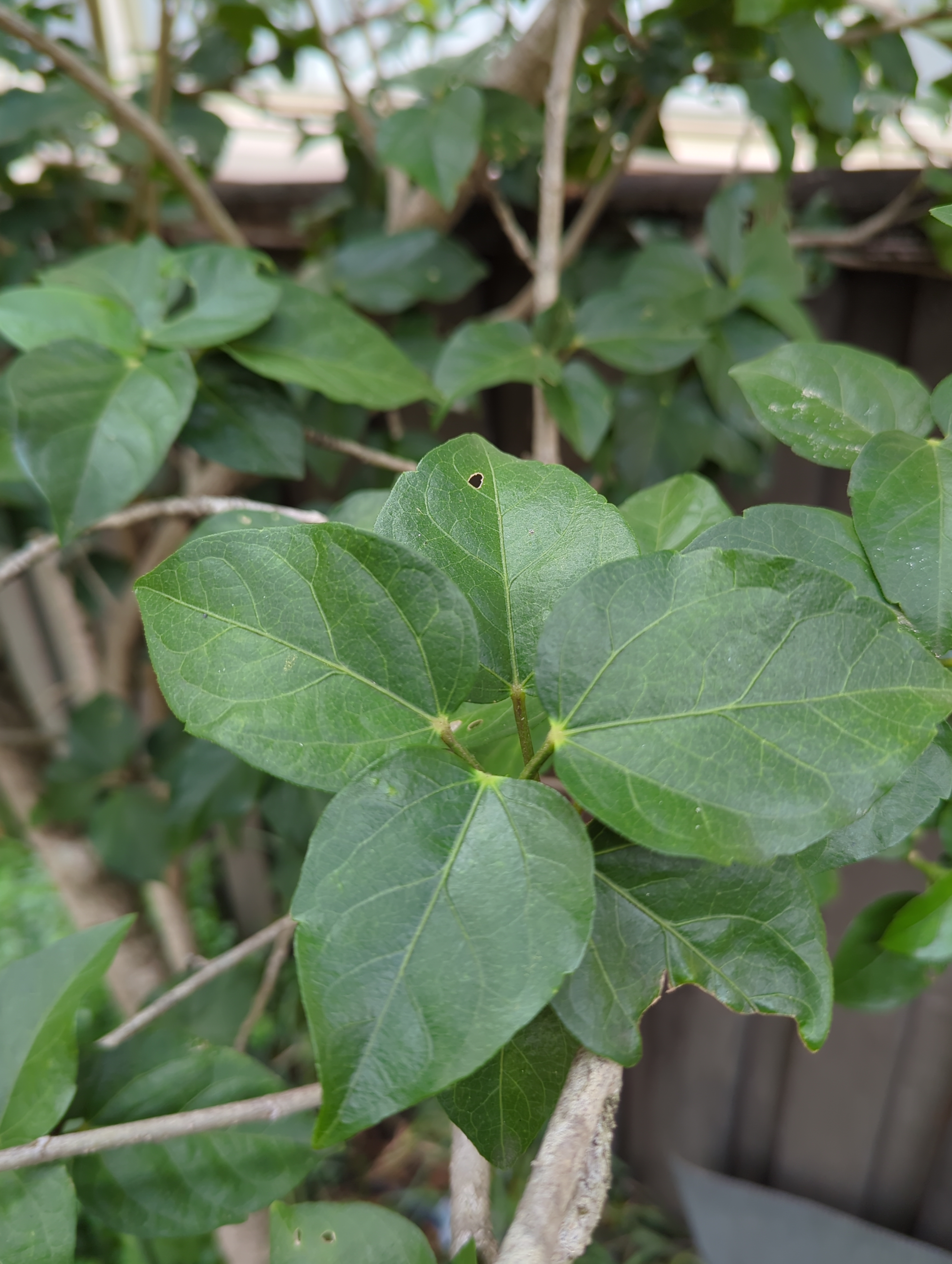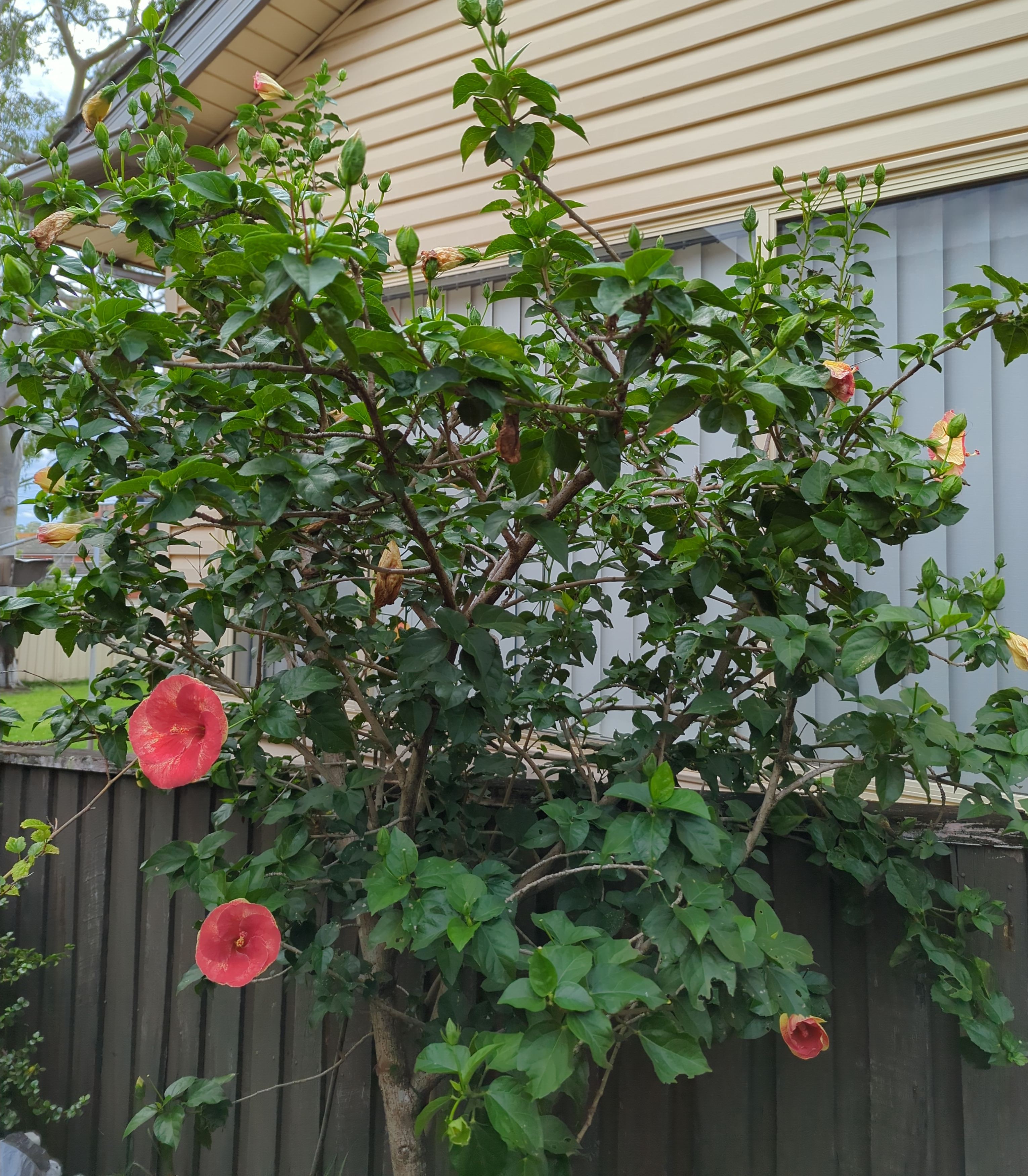 Hibiscus × rosa-sinensis is a bushy, evergreen shrub or small tree growing 2.5–5 m tall and 1.5–3 m wide.