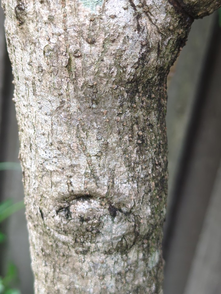 The bark of the Hibiscus x rosa-sinensis- Lava glow trunk is also an attractive textured grey that also stands out among the deep green of the leaves and bright red and yellow of the flowers.