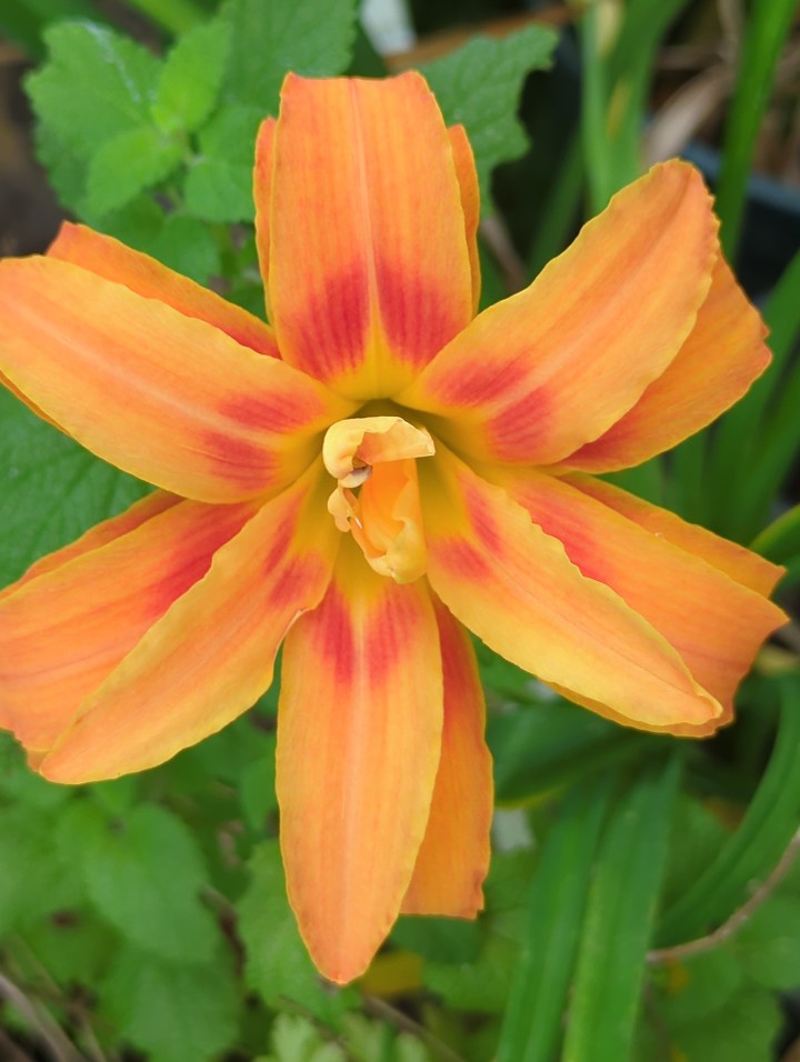 Daylilies usually have six stamens, Kwanso daylily may have no functional stamens visible, as they are modified into petal-like structures called petaloid stamens. This creates the appearance of a lush layered flower with beautiful frilled edges to the tepals along with a burgandy in the throat of the bloom.