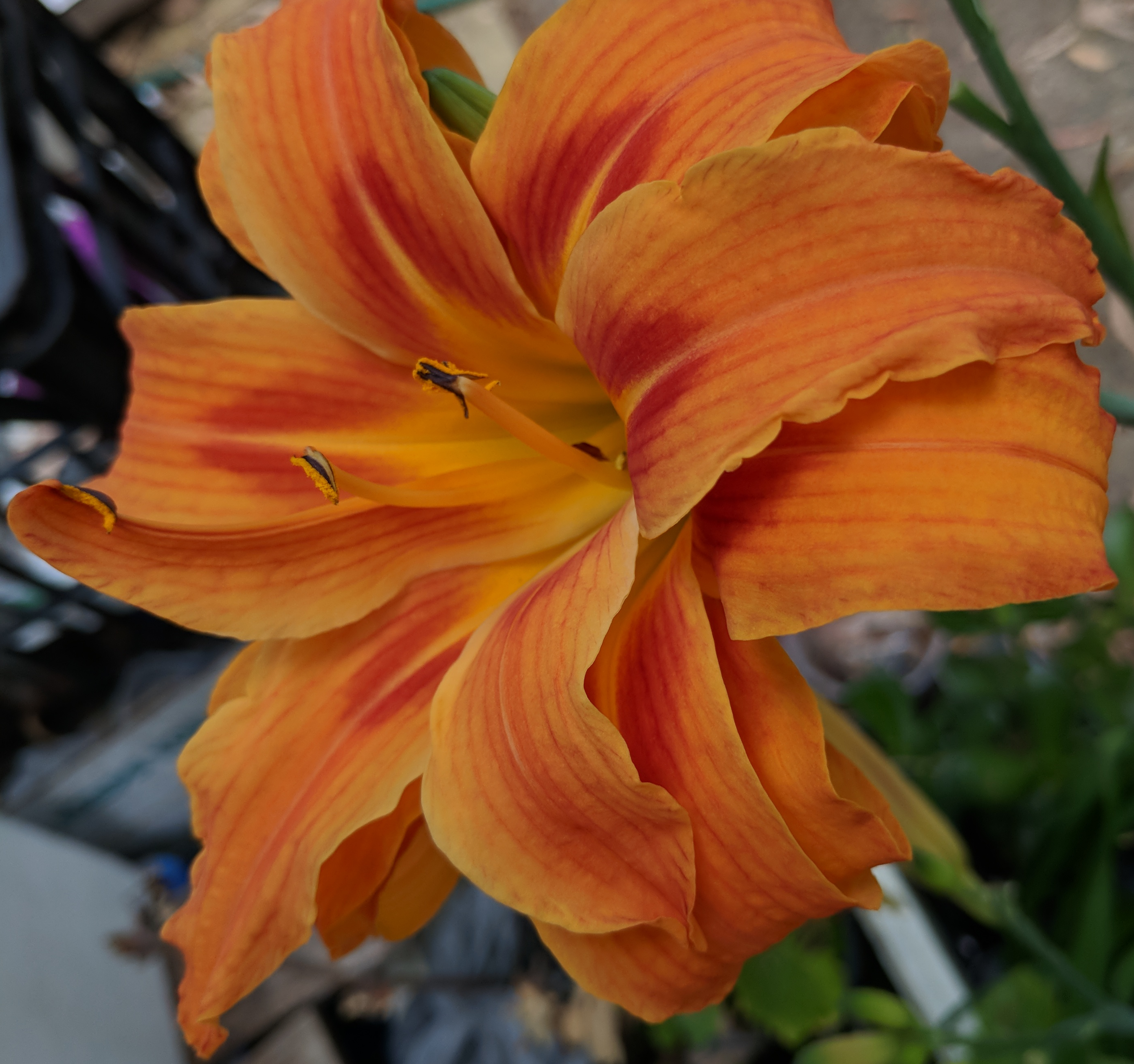 Daylilies usually have six stamens, Kwanso daylily may have no functional stamens visible, as they are modified into petal-like structures called petaloid stamens. This creates the appearance of a lush layered flower with beautiful frilled edges to the tepals along with a burgandy in the throat of the bloom.