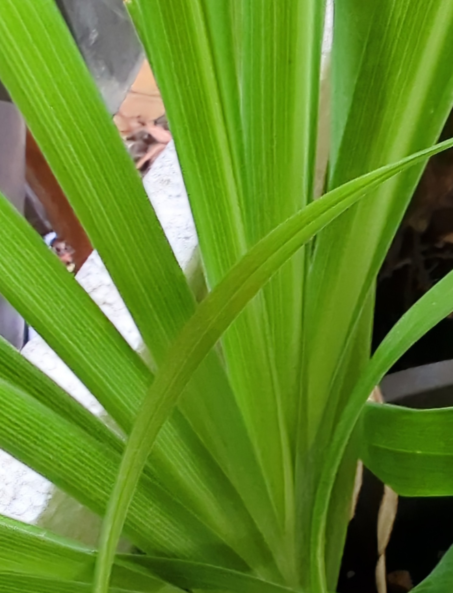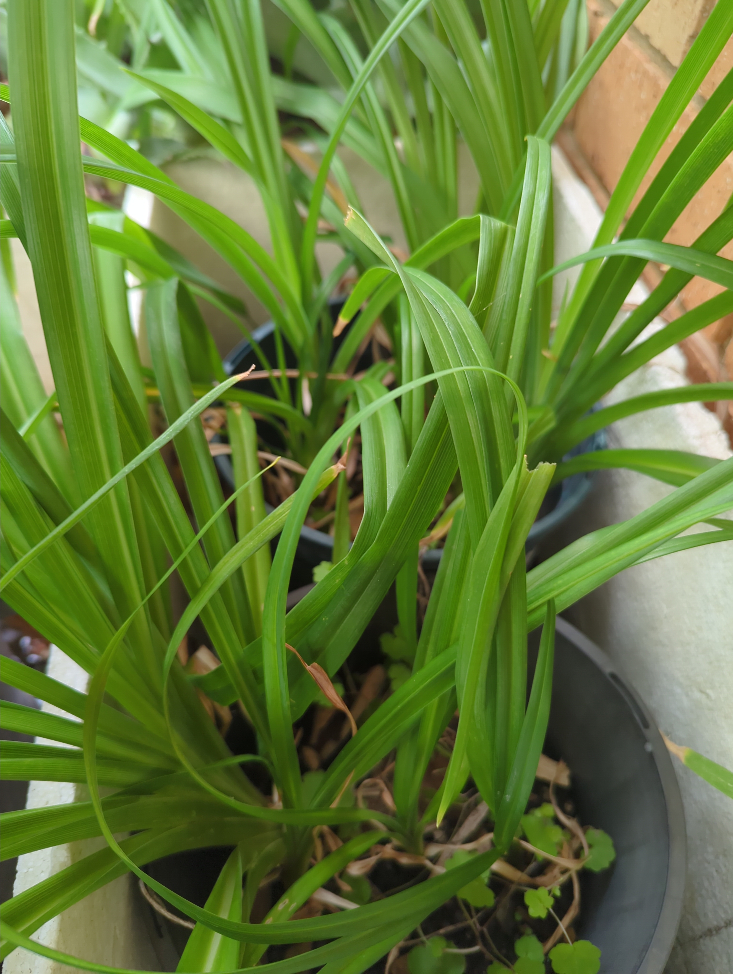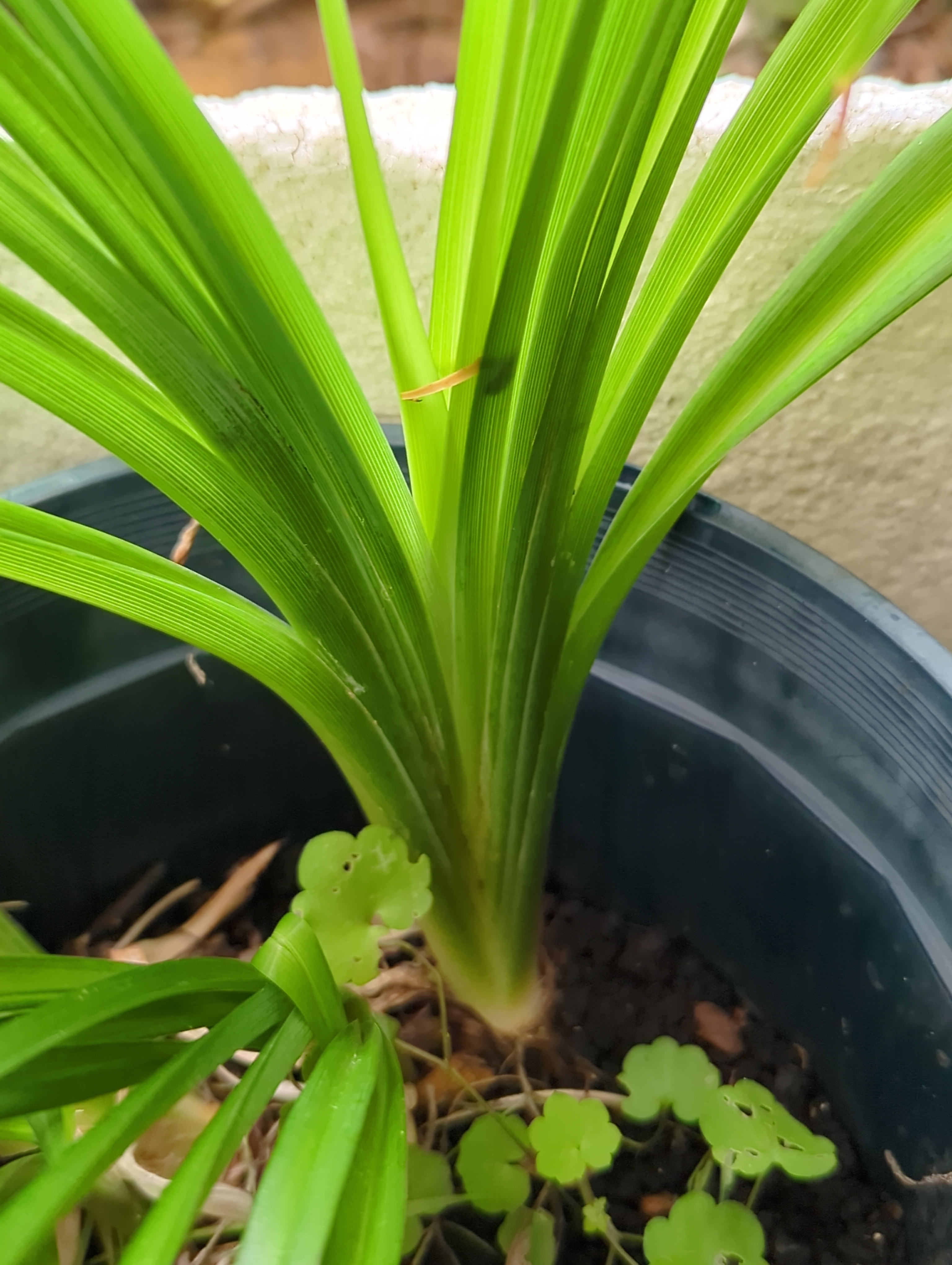 The arching leaves arise from the base of the plant and are strap-like, long, linear lanceolate leaves and grouped into opposite fans. The crown is the small part between the leaves and the roots. This can be seen in the image above.