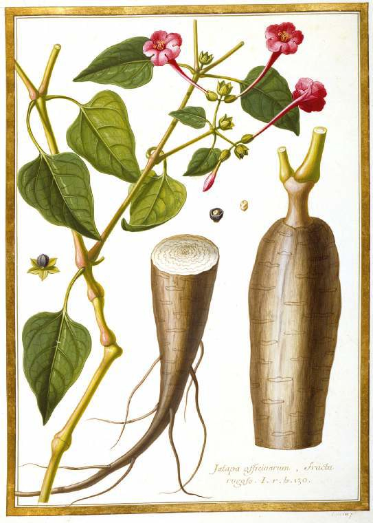 Below is a botanical image of the Mirabilis jalapa showing the tuberous root.